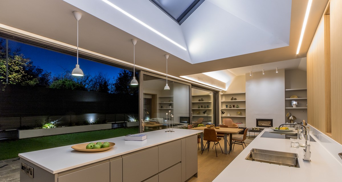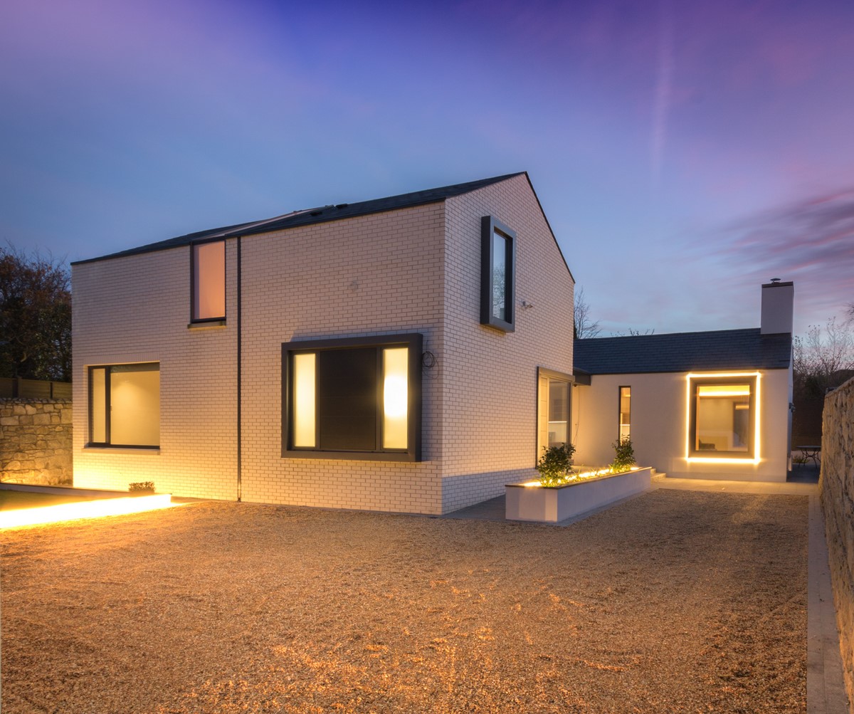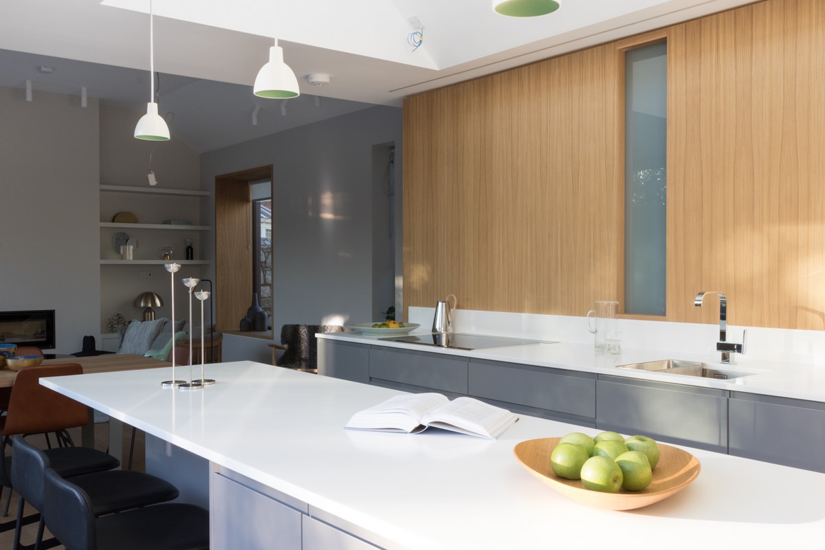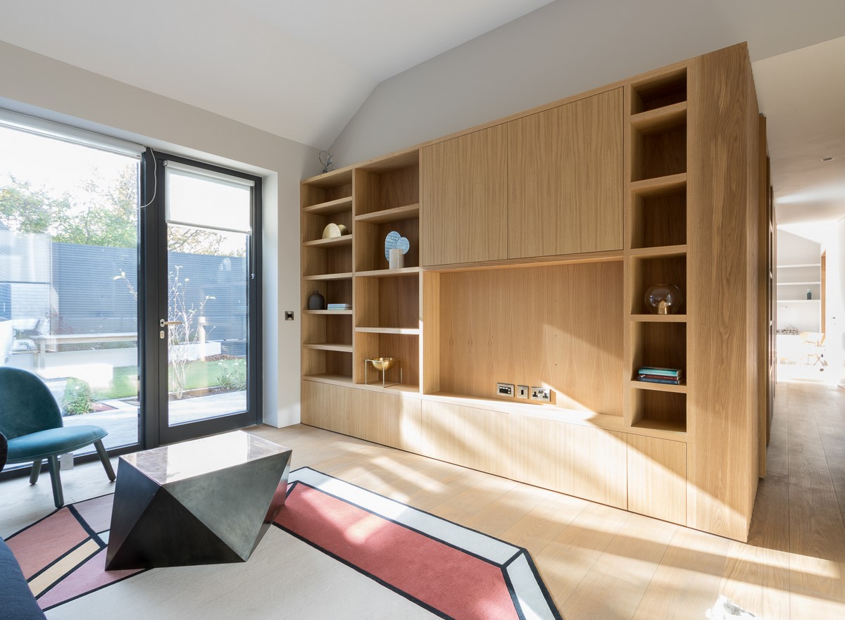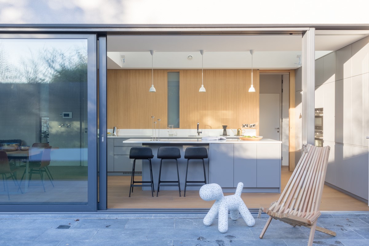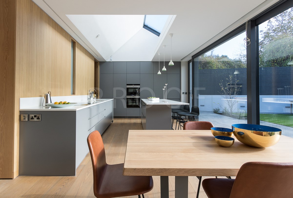 Contemporary rear garden downsizing home designed by Extend Architects to create a good relationship with it’s surroundings whilst providing adequate privacy and capturing as much natural daylight as possible. The materials include natural slate, white brick, oak joinery and expansive glazing by Kokoon.