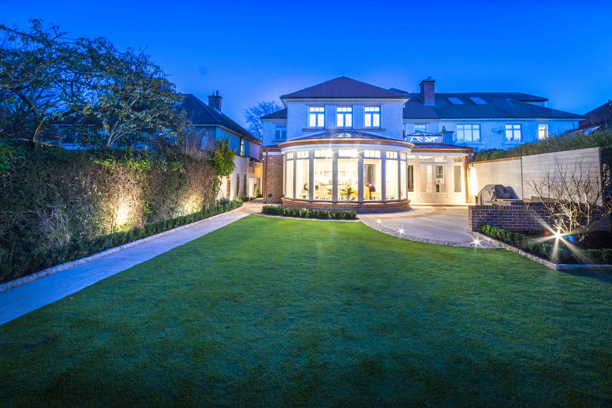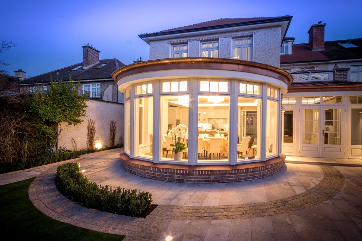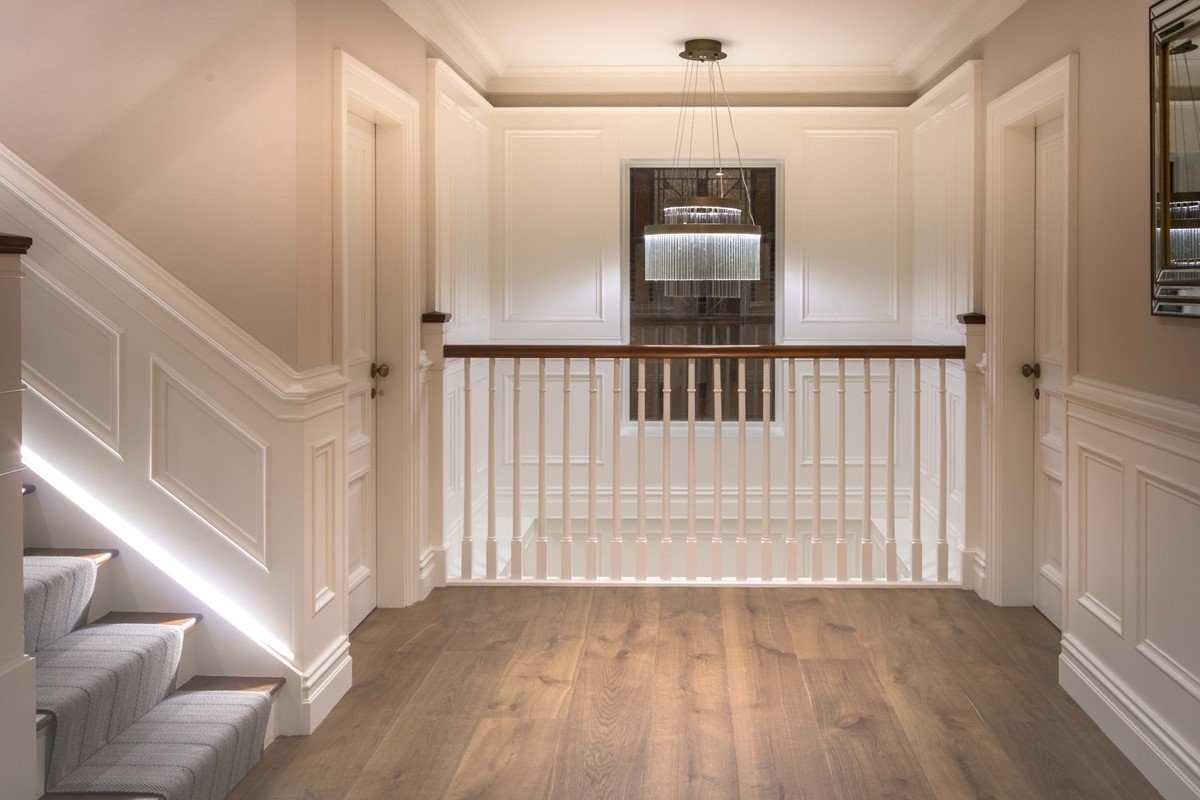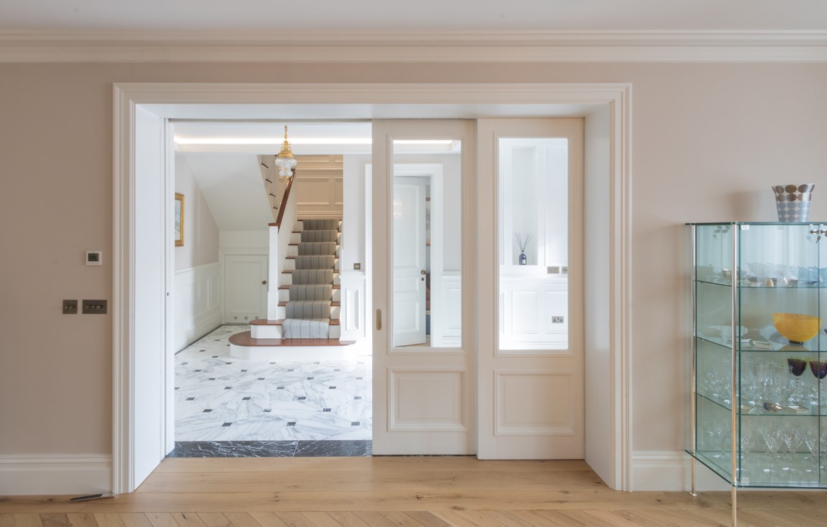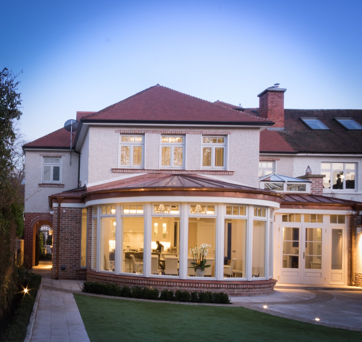 Rear extension to existing house designed by Node Architects with copper roof and windows by Kokoon. Beautiful interiors with natural stone bathrooms and flooded with daylight entrance hall & staircase with timber panels.