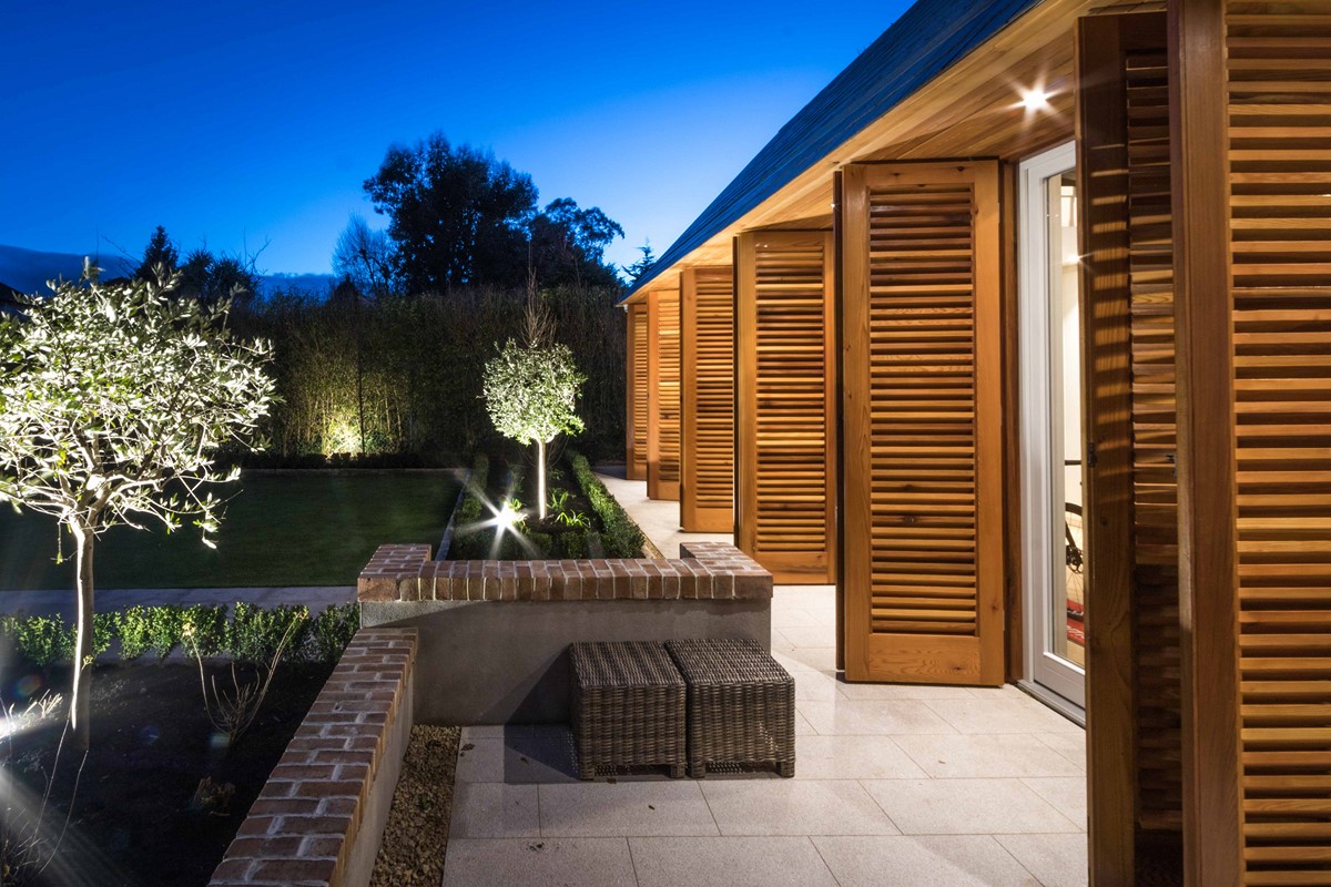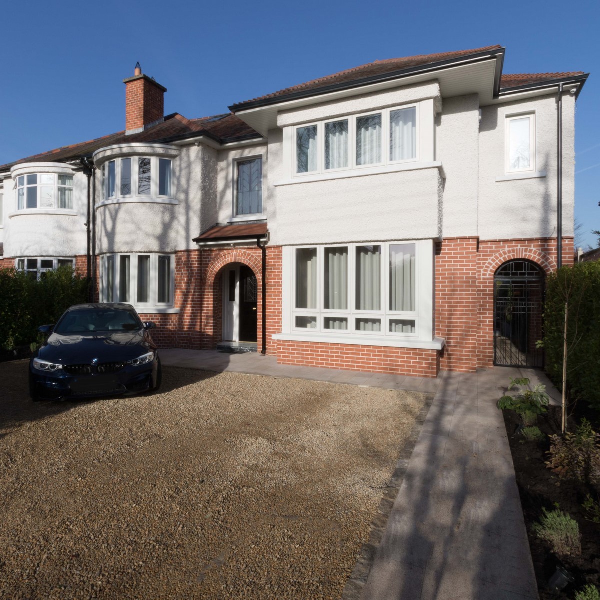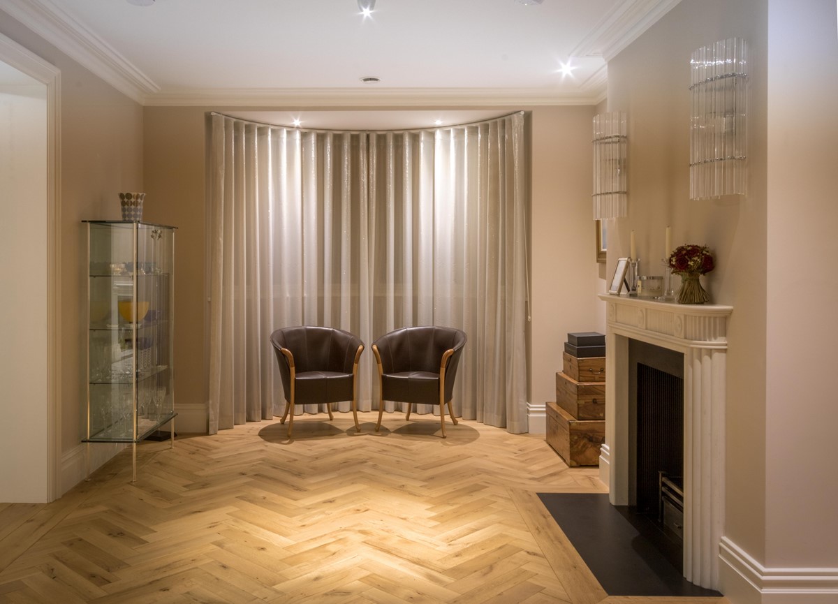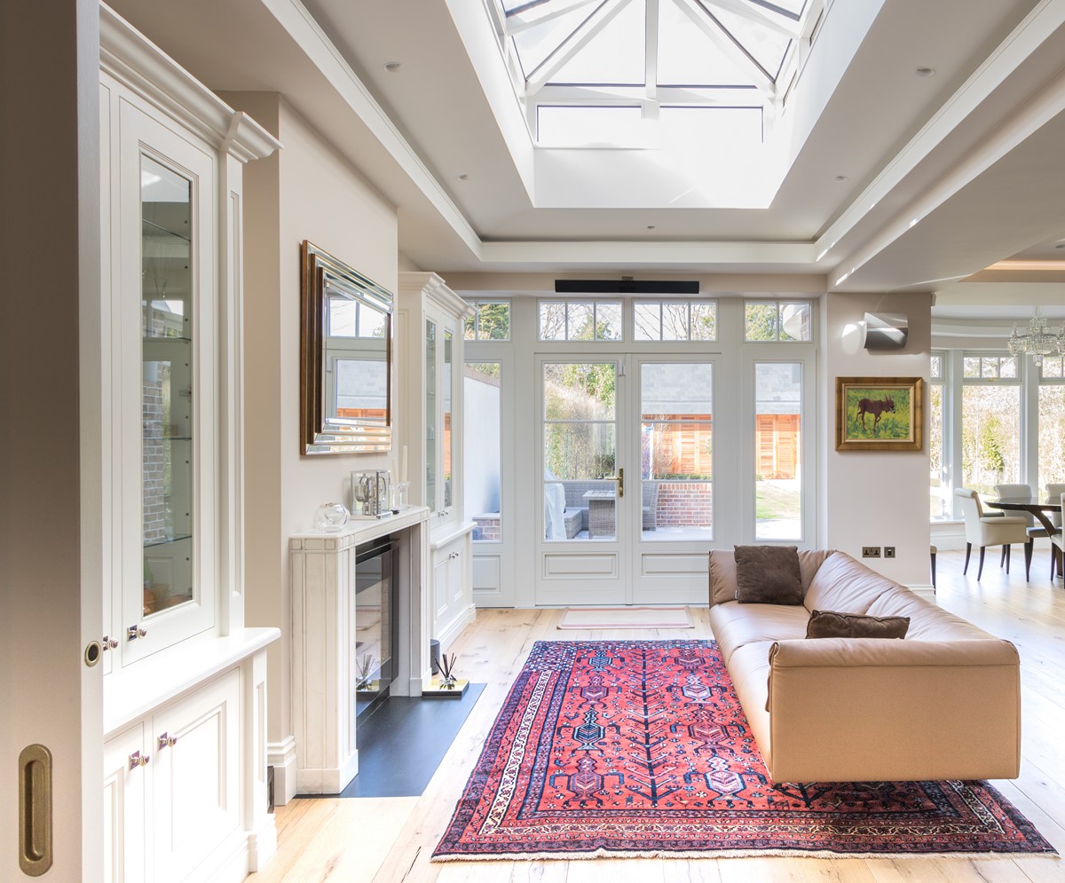 Rear extension to existing house designed by Node Architects with copper roof and windows by Kokoon. Beautiful interiors with natural stone bathrooms and flooded with daylight entrance hall & staircase with timber panels.