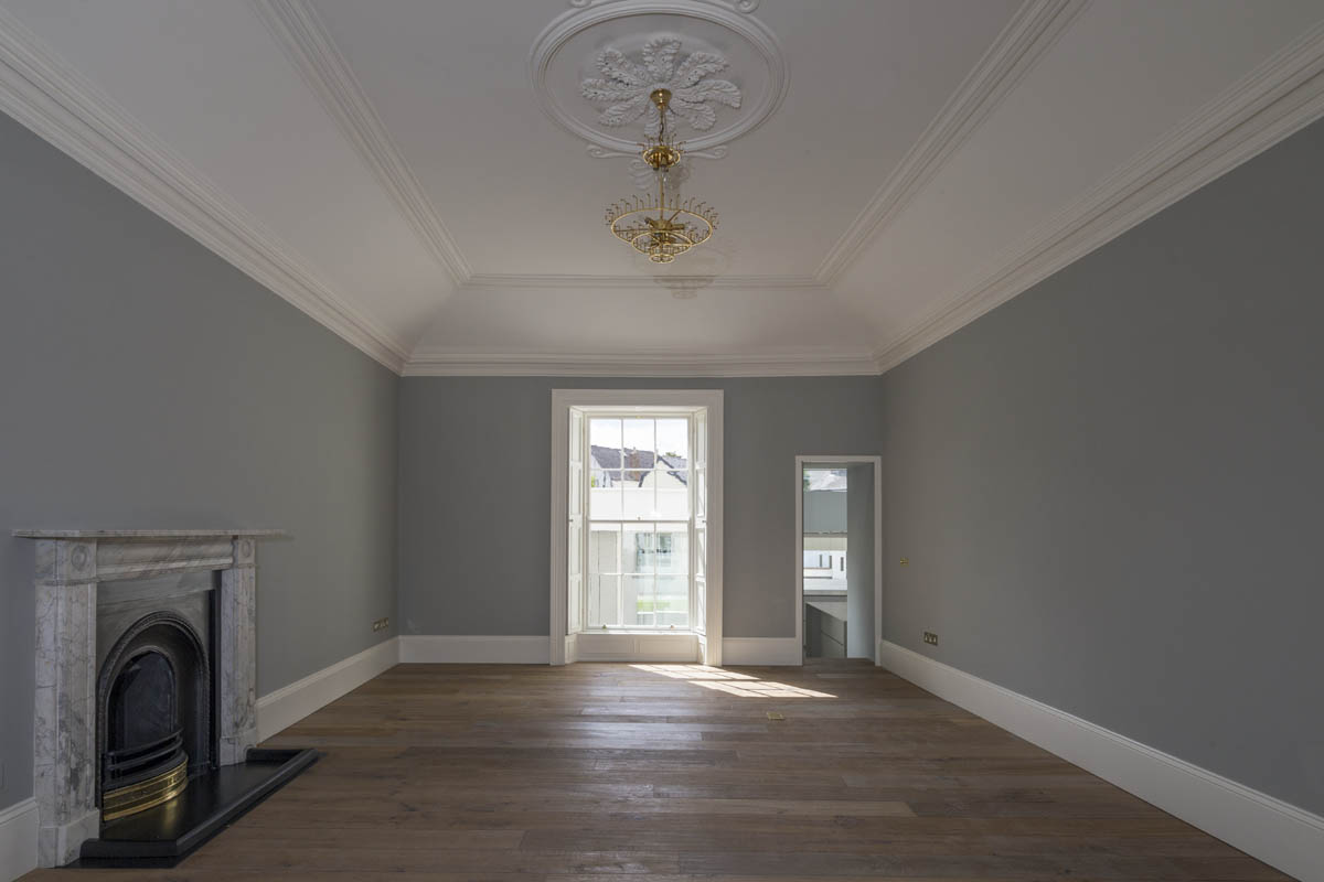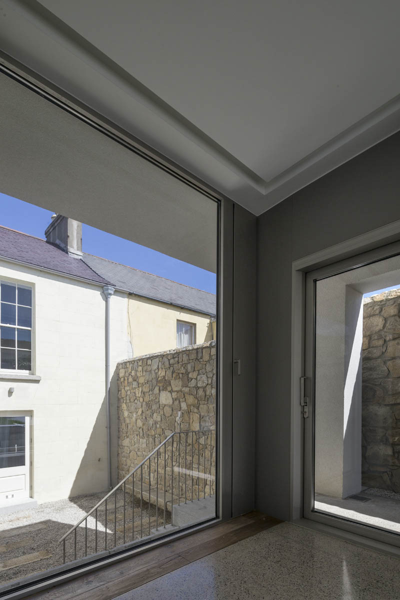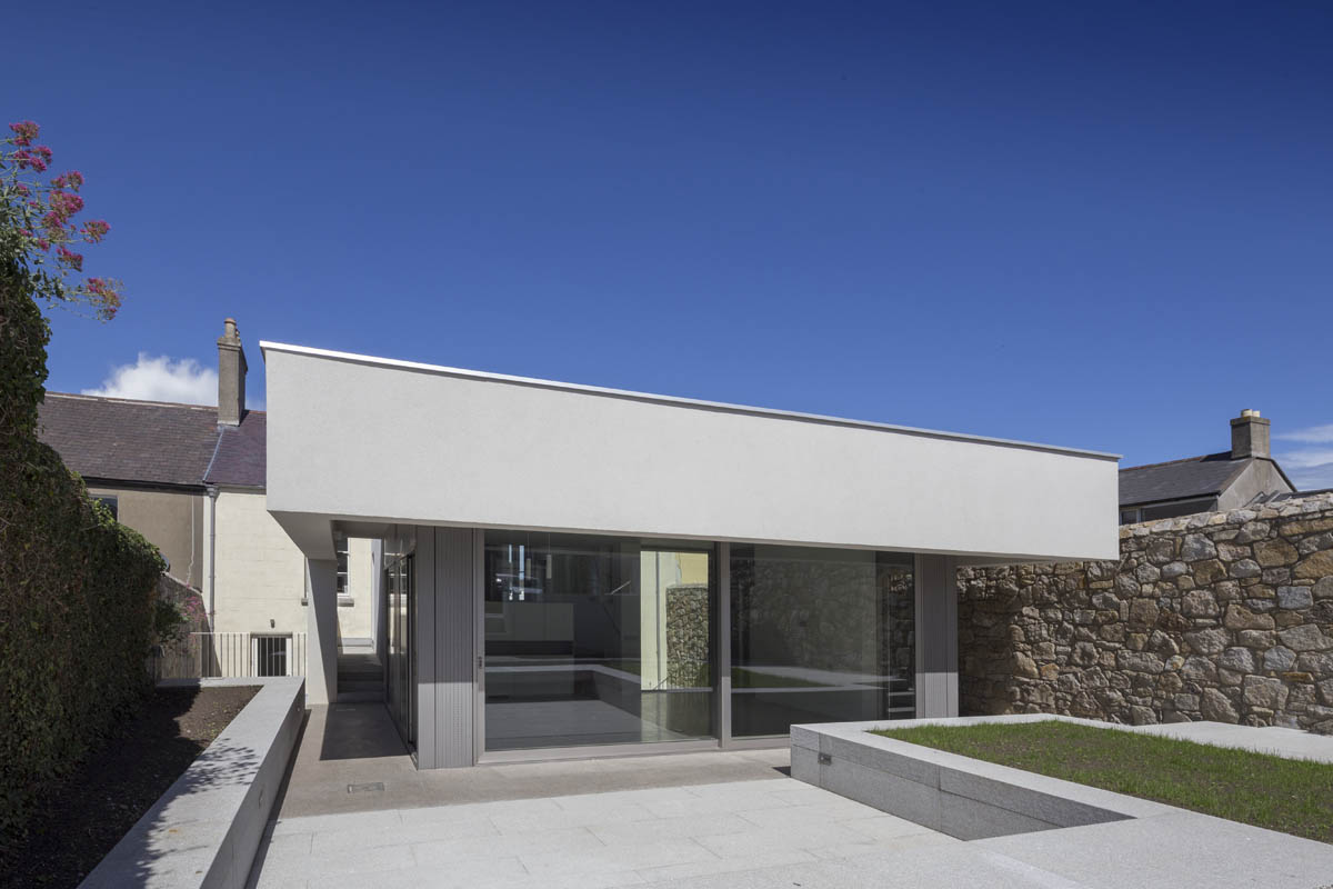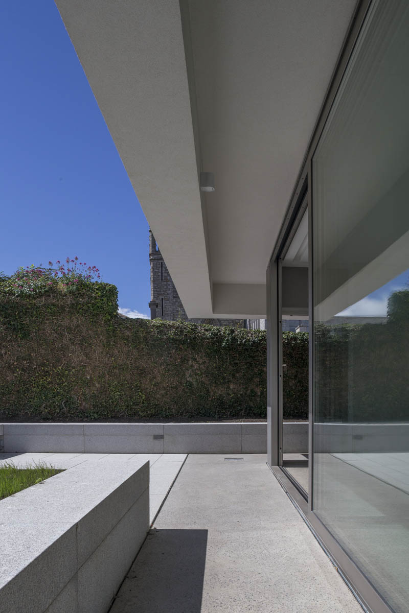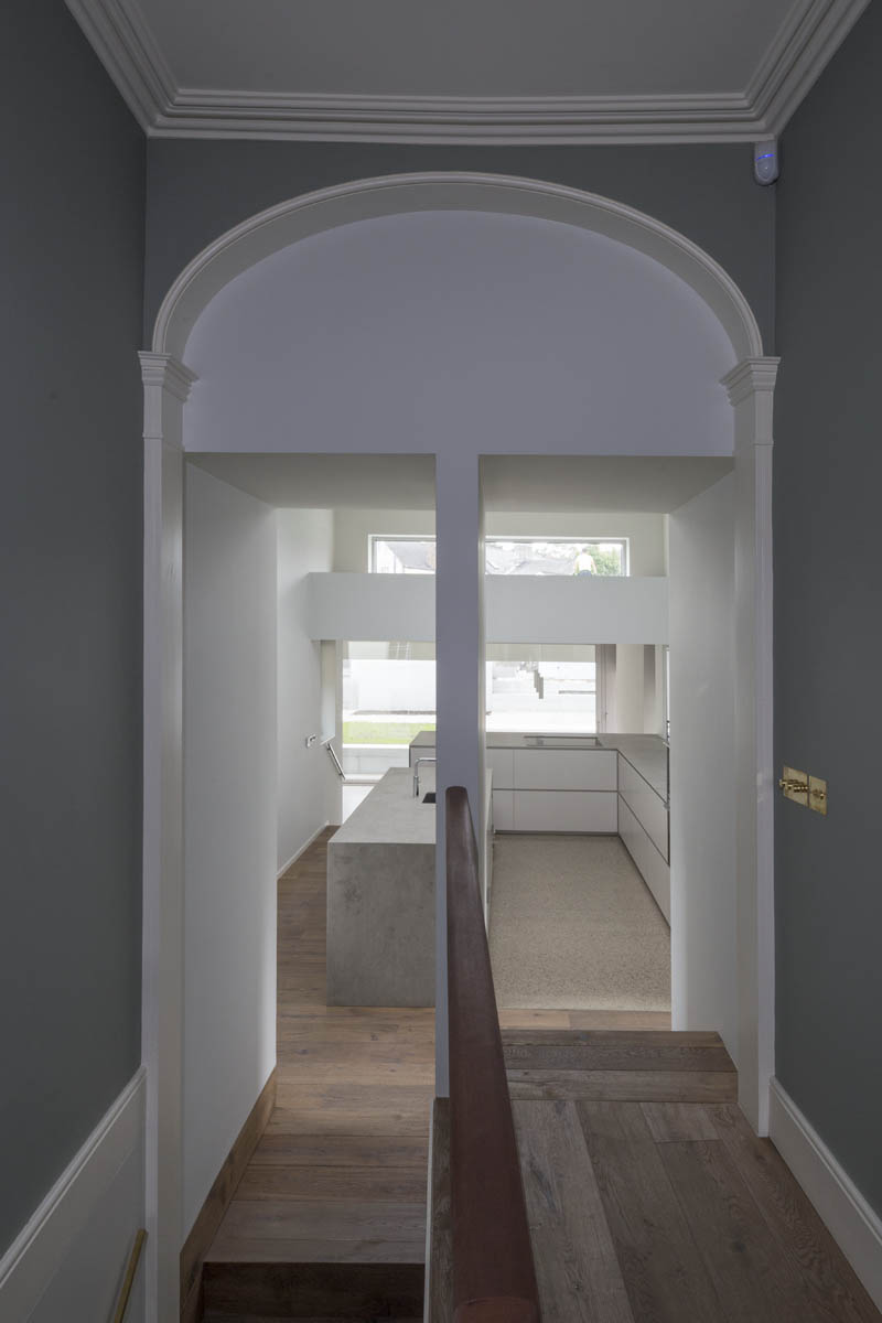 Extensive internal modification and renovation of an existing mid-nineteenth century, two storey, terraced protected house in a Residential Conservation Area including the demolition of the existing return and the construction of a new two storey, split level, addition to the rear, designed by Boyd Cody Architects. The large living space, characterised by a deep overhanging roof, opens onto a paved terrace area. The external walls of the living space are wrapped in satin anodised aluminium and glazed screen supplied by Kokoon.