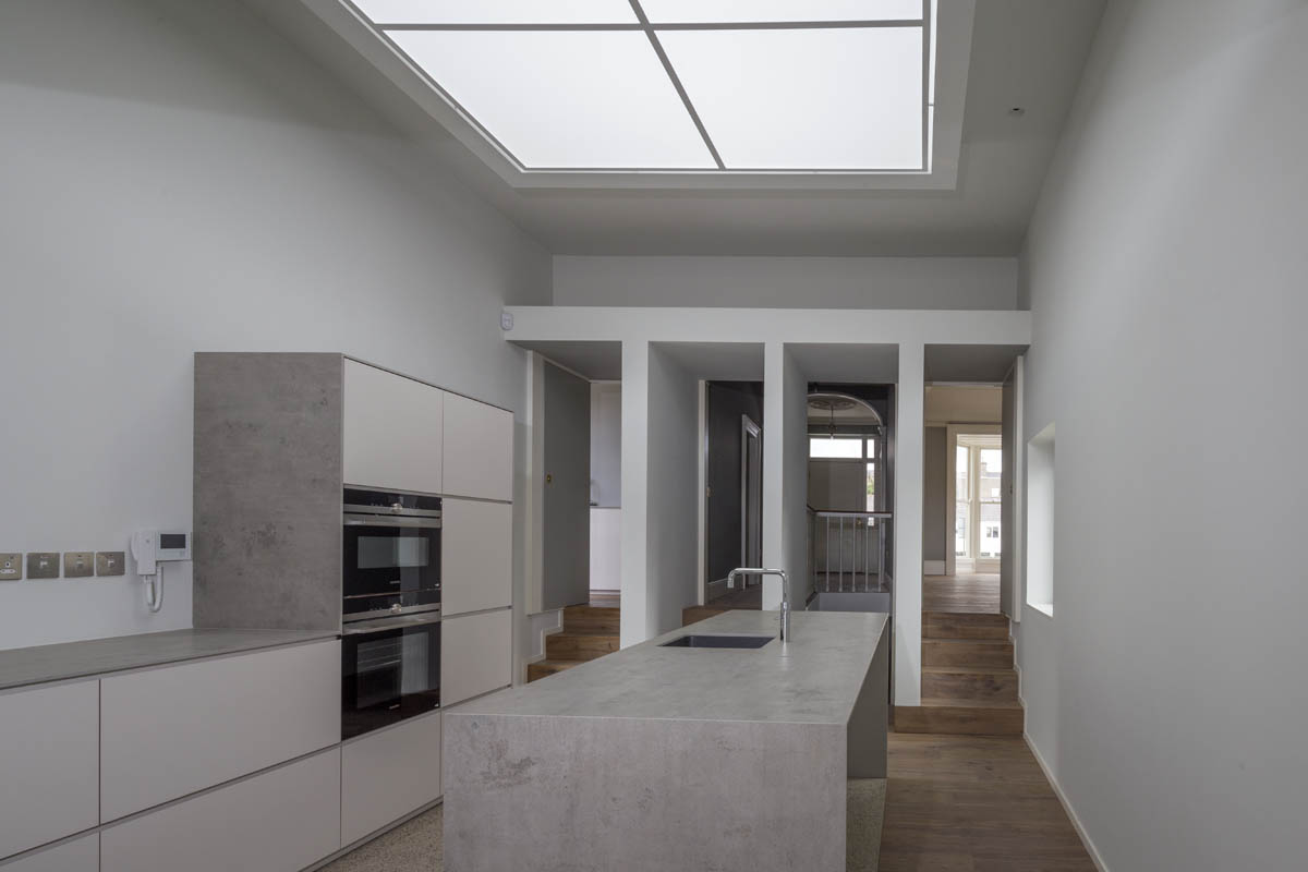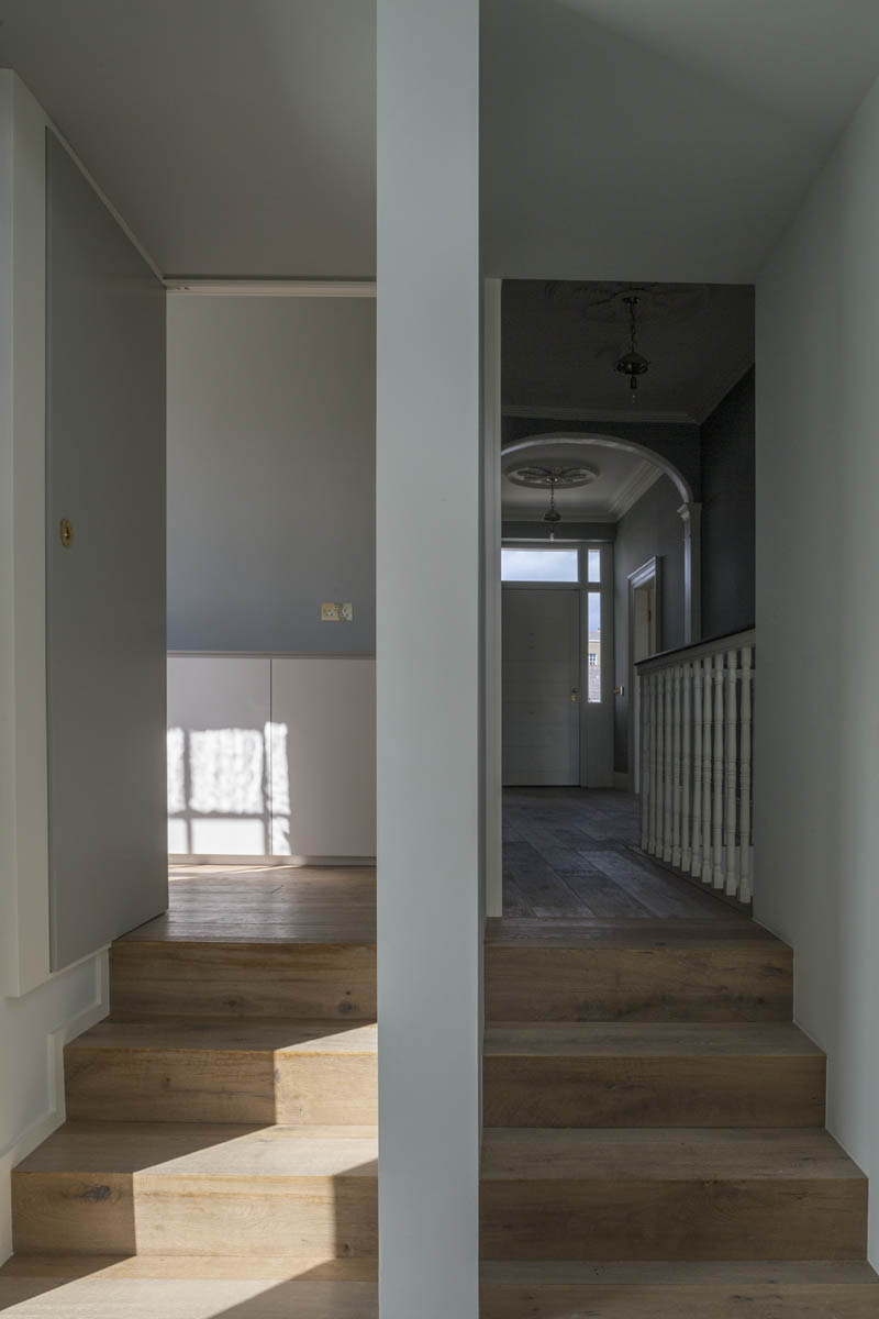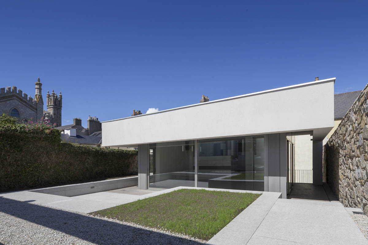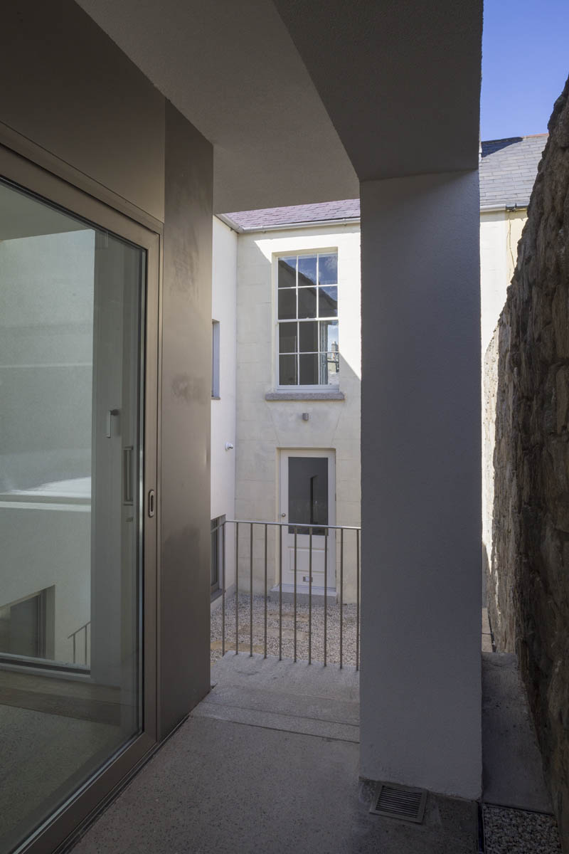 Extensive internal modification and renovation of an existing mid-nineteenth century, two storey, terraced protected house in a Residential Conservation Area including the demolition of the existing return and the construction of a new two storey, split level, addition to the rear, designed by Boyd Cody Architects. The large living space, characterised by a deep overhanging roof, opens onto a paved terrace area. The external walls of the living space are wrapped in satin anodised aluminium and glazed screen supplied by Kokoon.