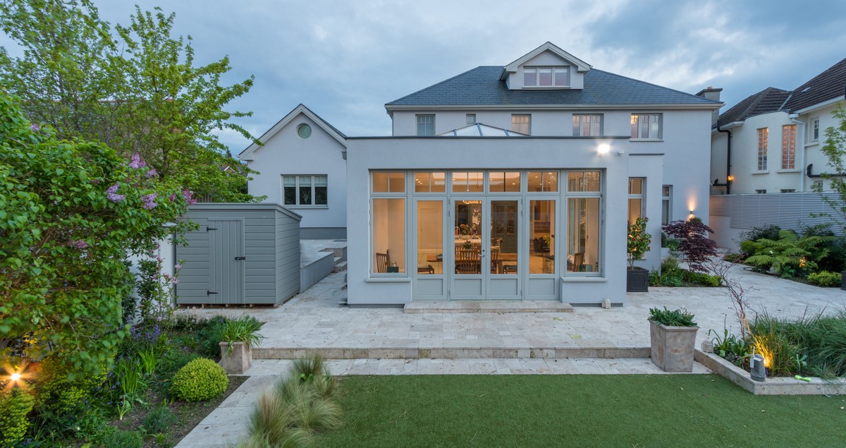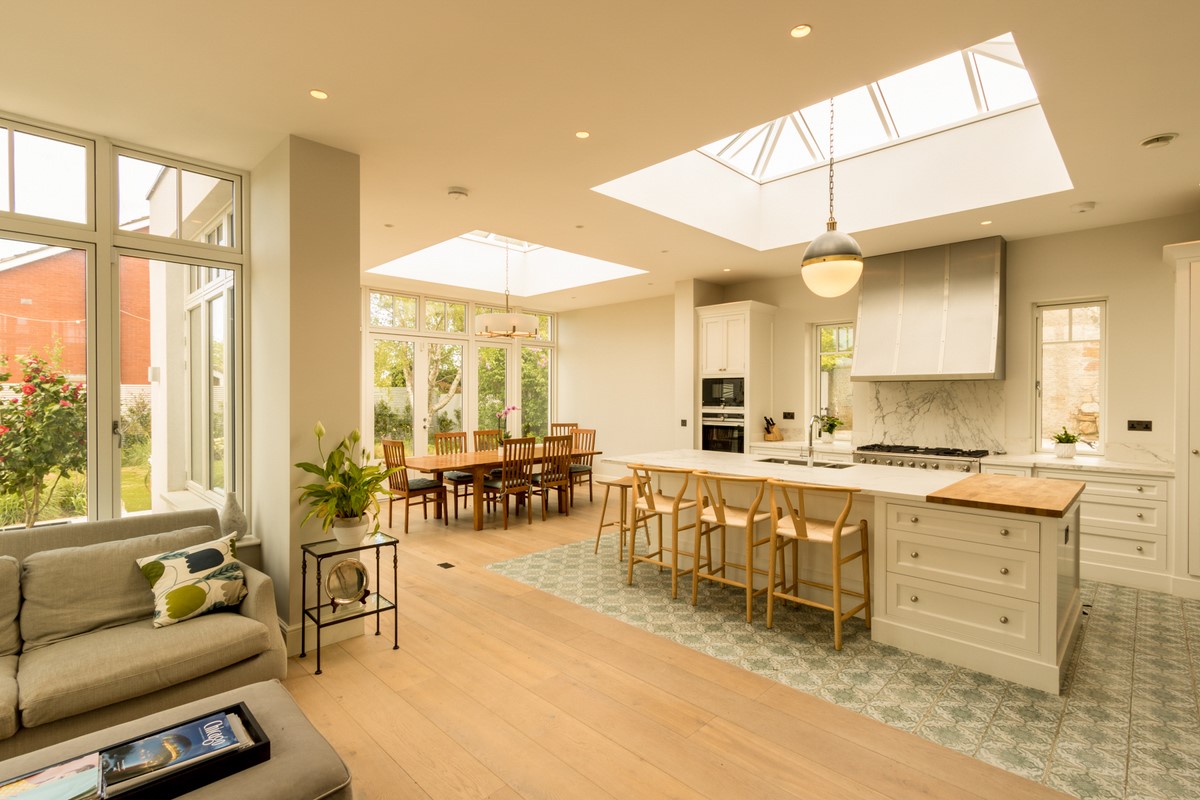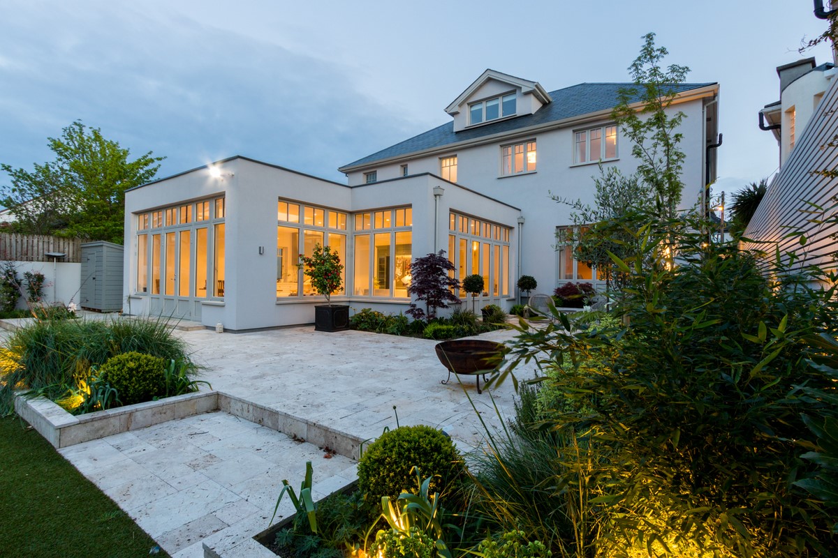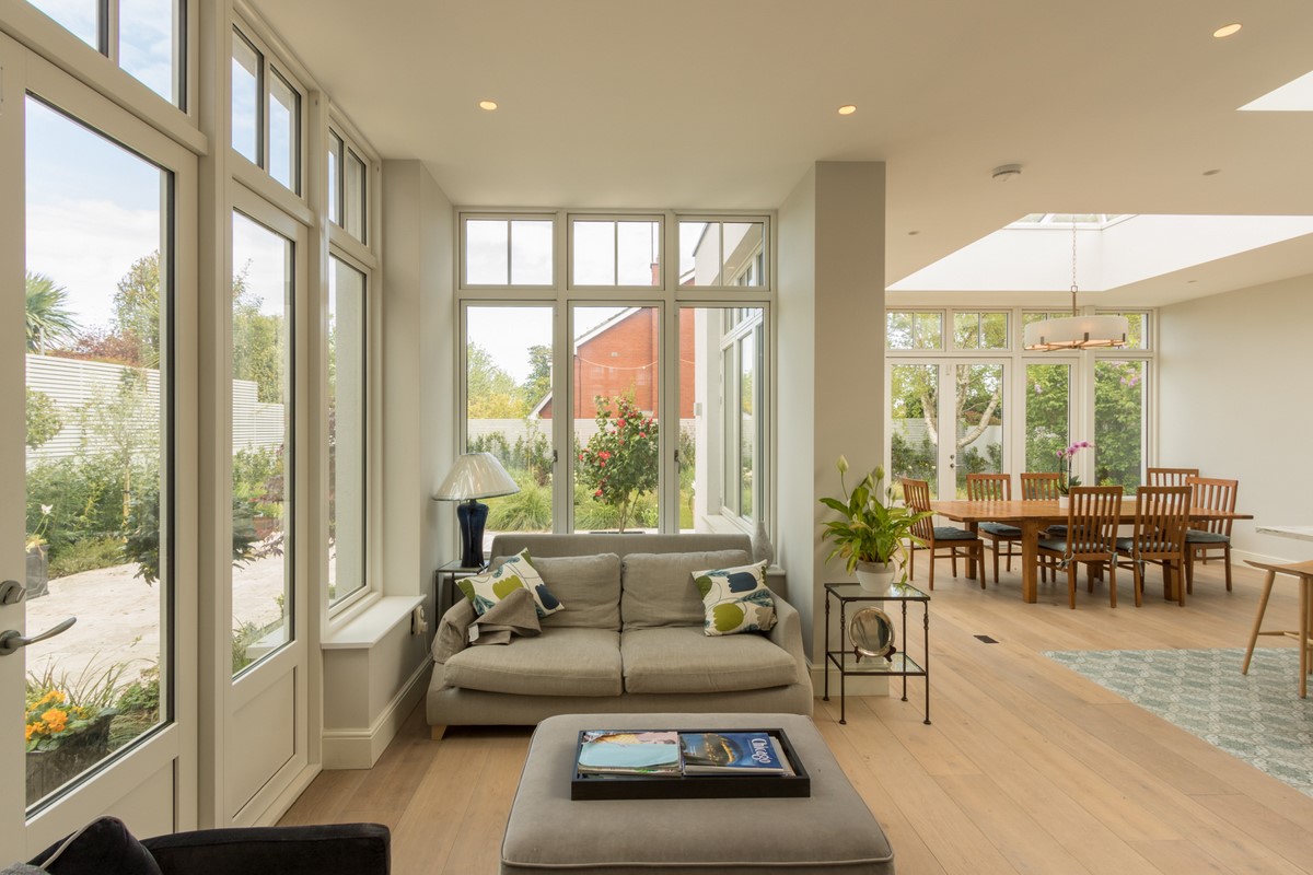 Demolition of existing house and build of new detached house designed by Extend Architects. Contemporary interior design with timber wall panels, hardwood floors and open plan kitchen to the rear. External windows & doors supplied by Kokoon.