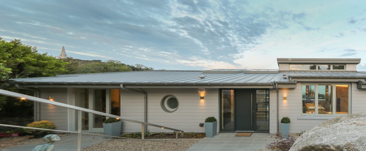 The new house designed by Brazil Atchitects is situated to take advantage of the amazing views and maximise this with the wide spans and large glazing panels creating this contemporary and well balanced house. Externally the house is clad in a sharp muted brick and rain screen fibre cement panels topped with a standing seam zinc roof. The house has a large amount of automation and the large glass screens to the rear are automated and controlled by the management system. (Paul)